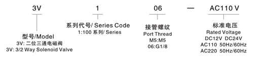 ![]() ■ 型号命名 ![]() ■ 举例 ▲欲订购接管螺纹为M5,标准电压为AC220V,3V1系列电磁阀,其正确的订购码为:3V1-M5-AC220V | |||||||||||||||||||||||||||||||||||||||