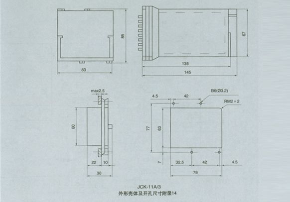 继电器采用JCK-11A/3壳体,外形尺寸、安装开孔图。